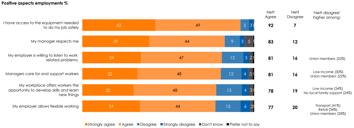 Most workers rate their employment positively on matters of safety, how they are treated, and learning opportunities. However, union members, low-income earners, and workers in retail and transport industries are over-represented among those who rate their employment negatively on some of these things.
